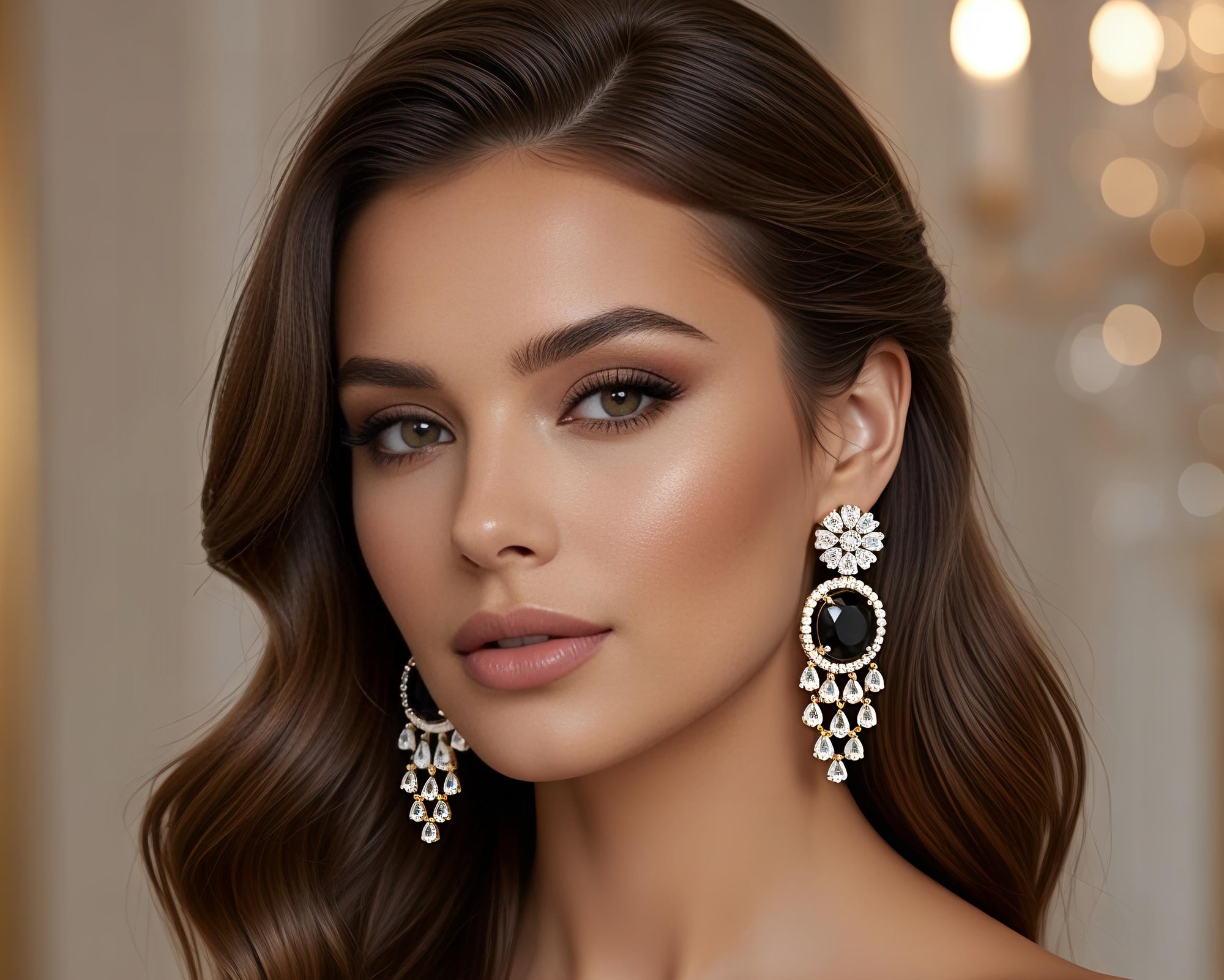 Luxury Gold Drop Earrings with Black Stud – Elegant Designer Party Wear Earrings for Women