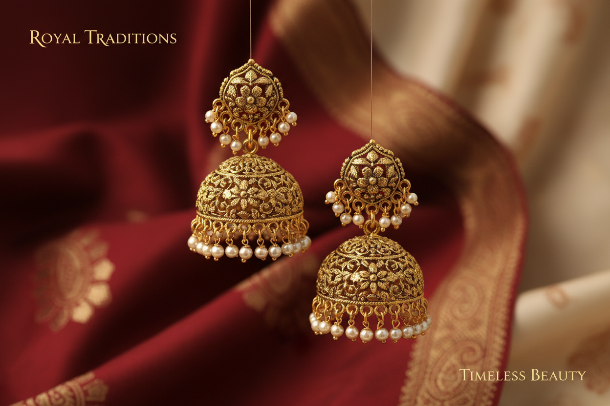 Elegant Gold Jhumka Earrings with Black Stone – Traditional Bridal & Party Wear Jewelry For Women